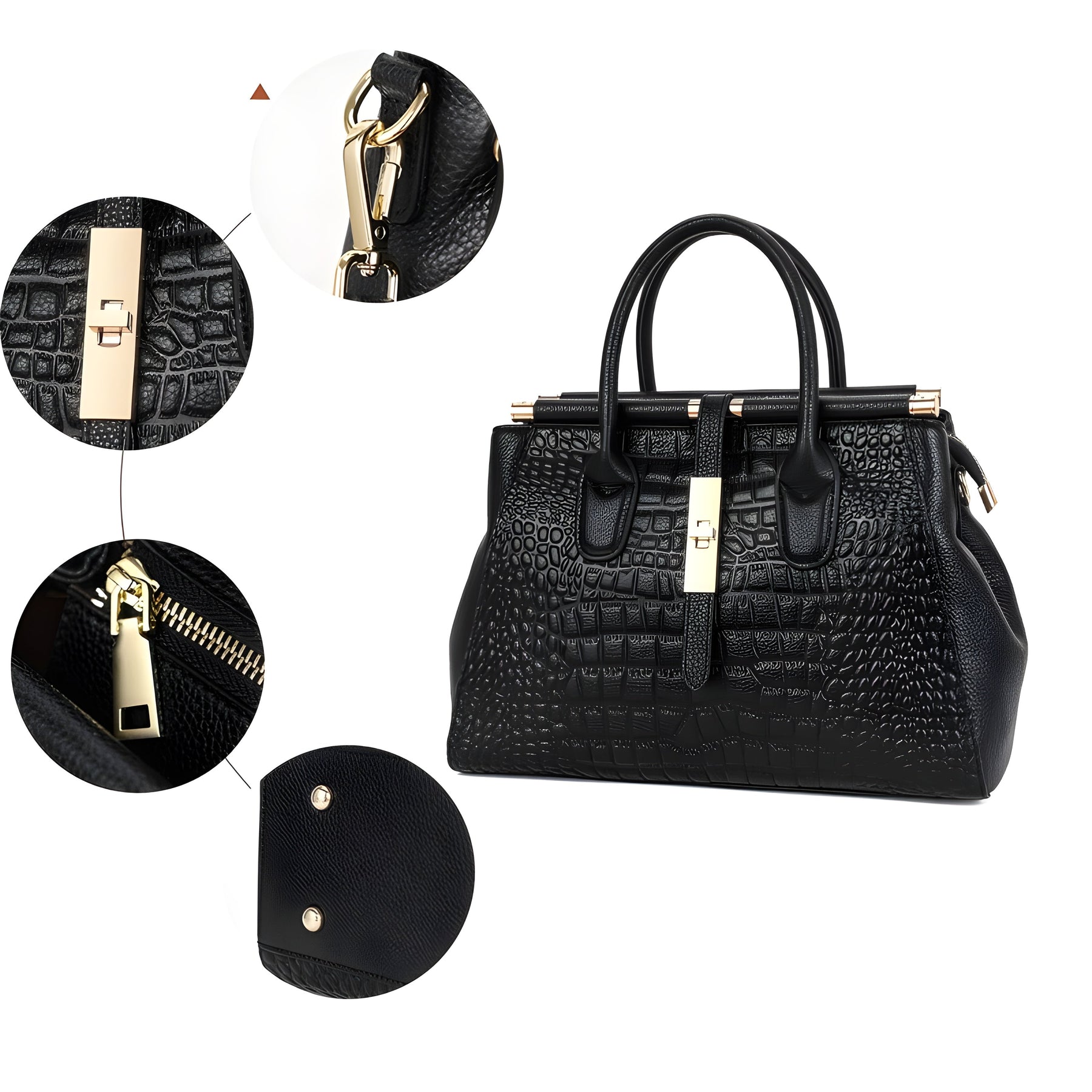 Refined elegance meets modern sophistication with the Aurelia™ Croc Handbag. Designed in premium embossed cowhide leather, its textured alligator-inspired finish brings a touch of timeless luxury to your everyday style. The structured silhouette is elevated by a gold-plated magnetic snap closure, creating a striking contrast against the sleek black leather for an effortlessly chic statement.
